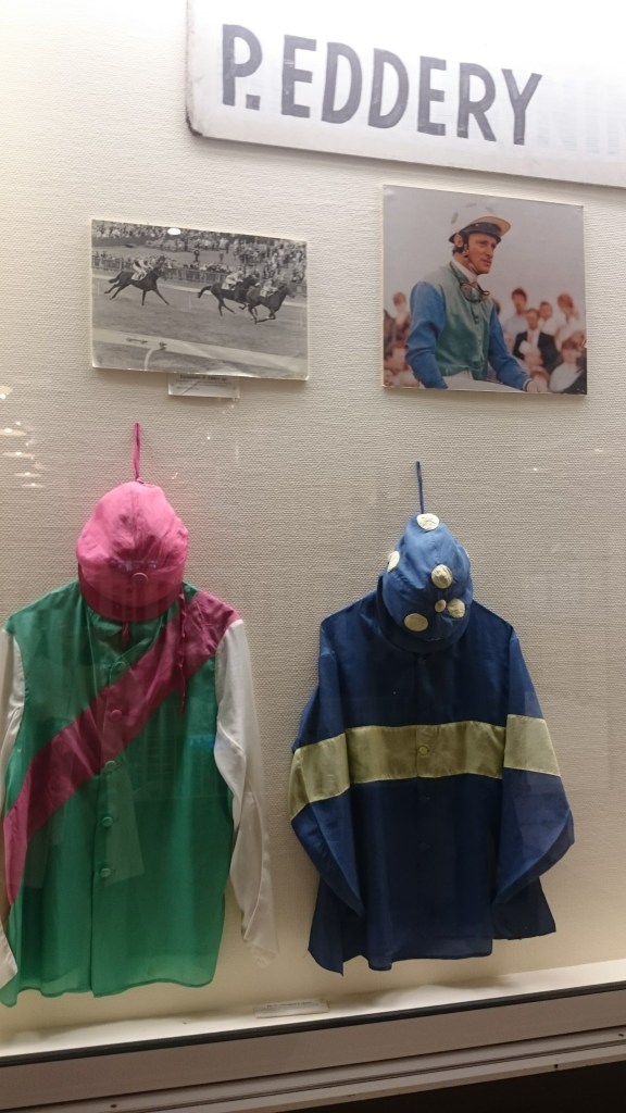 On the 1st floor as you’re going up the escalators, do stop off and look at some of the racing paraphernalia, which includes Pat Eddery’s Dancing Brave colours.